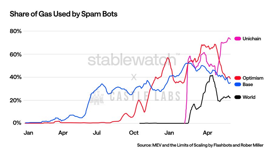 • Solana 和 Base 等低费用网络上存在 MEV 和套利机会,这刺激了大量的交易垃圾信息产生。