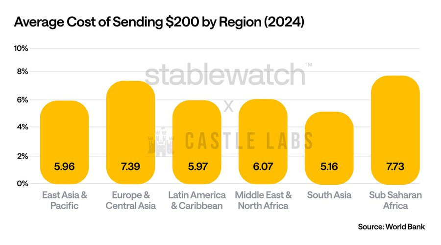 其中,稳定币支付旨在消除与传统汇款相关的摩擦税。根据世界银行的数据,汇款用户平均损失6.35%,银行对200美元的汇款平均收取12.66%的费用。