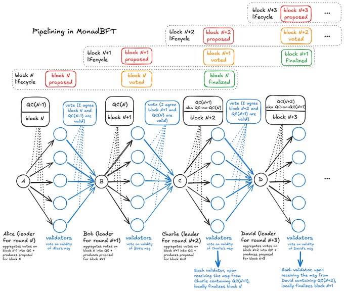 Monad 通过同时运行多个进程(而非按顺序执行所有操作)解决了速度问题。它采用 MonadBFT 共识机制(基于成熟的 HotStuff 算法),能够应对恶意行为者,并以流水线批量处理交易。这使得 Monad 能够在并行流水线中同时处理不同的交易,从而显著提高吞吐量。
