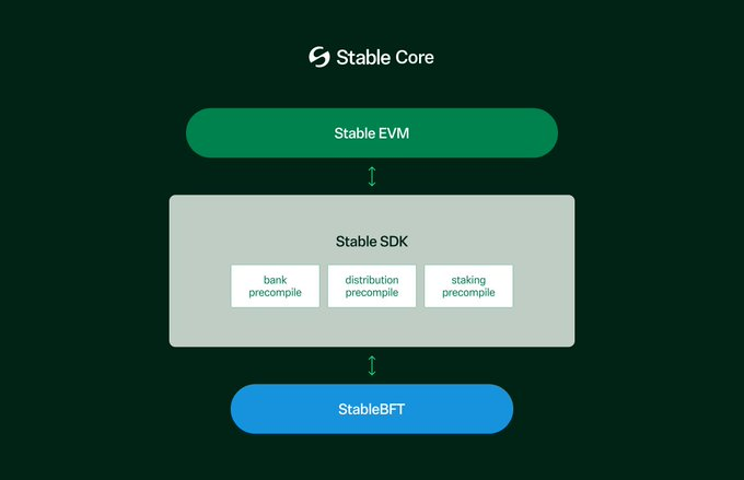 该网络是使用 StableBFT 的 Layer 1,这是一种基于CometBFT(Tendermint 的一个成熟分支),为多达三分之一的验证者提供确定性的最终性和容错能力。该平台实现了亚秒级的出块时间和最终性,确保交易快速完成,从而支持实时结算。通过 Stable SDK,StableBFT 将能够通过一组预编译合约与 Stable EVM(一个兼容以太坊的执行层)进行通信。这些预编译合约将原生的 StableSDK 模块功能开放给 EVM 智能合约,使它们能够安全且原子地与核心链逻辑进行交互。