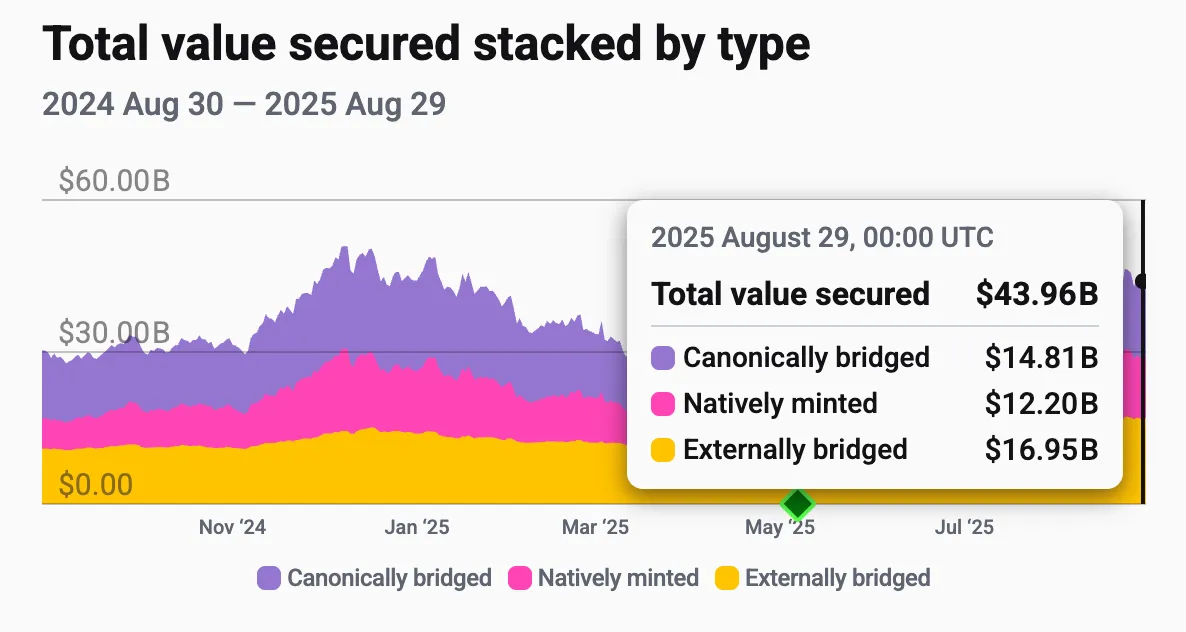 - 外部桥接从 2023 年后期开始急剧增长,到 2025 年初超越官方桥接,标志着以太坊失去 Rollup 资产的多数份额。