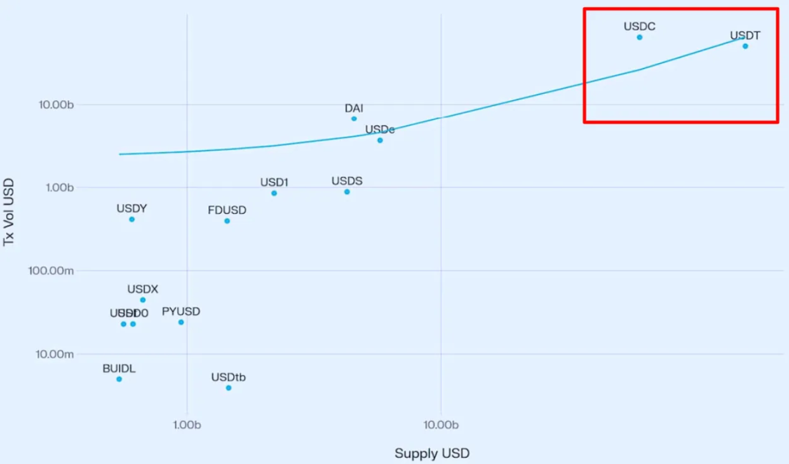 研究数据也支持这一方向。Vedang Ratan Vatsa 的研究表明,稳定币的供应量与交易量呈显著正相关:供应量越大,流动性越深,应用落地程度也越高。作为两大头部发行方,Tether 与 Circle 无疑具备捕捉这一机构资金流的优势。