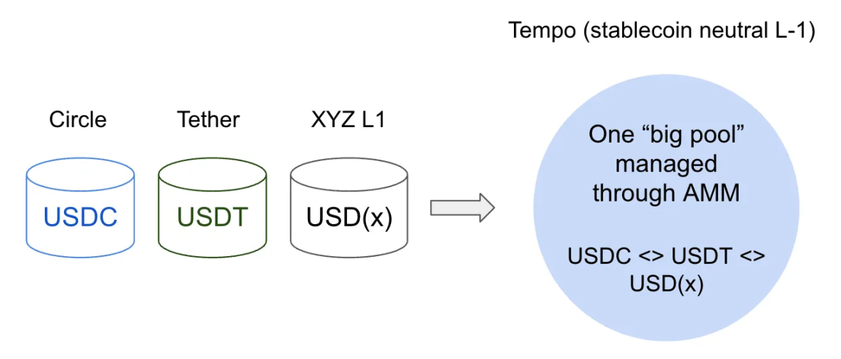 - Stripe 的 Tempo:选择了不同的路径,保持「稳定币中立」。它不绑定某一种稳定币,而是通过内置自动做市商(AMM)支持多种美元稳定币,这对追求灵活性的开发者、以及不局限于某一种美元代币的用户来说,吸引力可能更强。