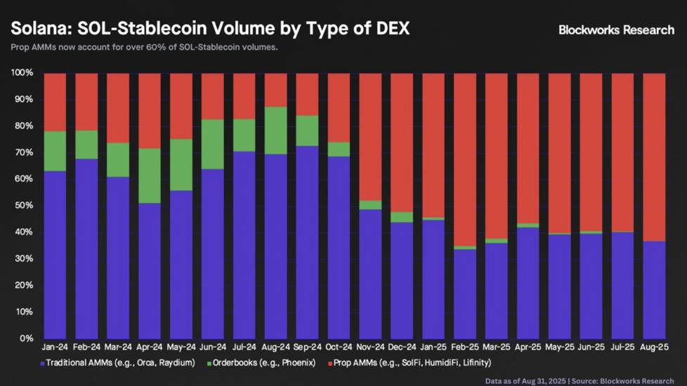 根据Blockworks的统计,仅在2025年8月,自营AMM在Solana上合计处理了约470亿美元的现货交易,占据Solana链上DEX总交易量的31%。在如SOL-稳定币这类高流动性交易对上,这一趋势更为惊人——自2025年5月以来,自营AMM每月都稳定地占据了SOL-稳定币交易对超过60%的份额,而在稳定币之间的交易对中占比甚至可以更高。