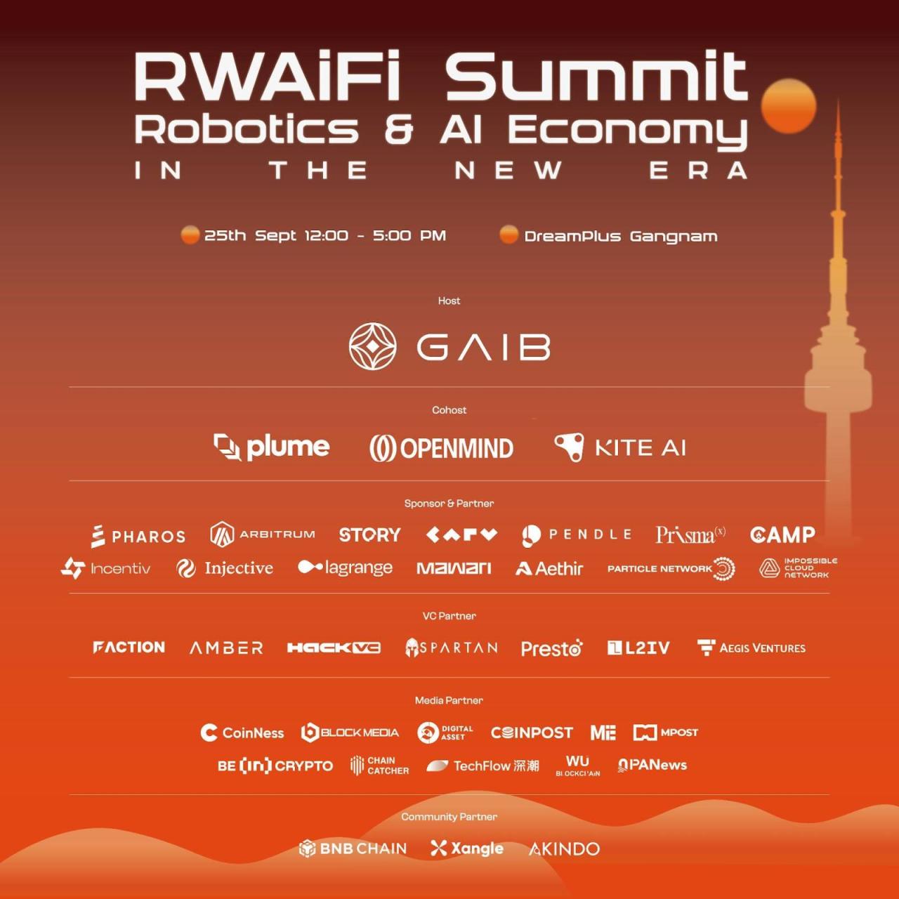 由 GAIB主办的 RWAiFi Summit于 9 月 25 日在首尔圆满落幕,活动吸引了 400 多位参加者,集结了 20 家顶级生态与项目,包括 Plume、OpenMind、Kite AI、Pharos Network、Arbitrum、BNB Chain、Story Protocol、CARV、Pendle、PrismaX、Camp Network、Incentiv、Injective、Lagrange、Mawari、Aethir、Particle Network、ICN Protocol等,以及 Faction VC、Amber Group、Hack VC、Spartan Group、L2 Iterative Ventures等知名投资机构支持,共同见证 AI、Robotics 与 DeFi 的交汇时刻,探讨算力、机器人规模化与现实世界资产金融化带来的全新机遇。