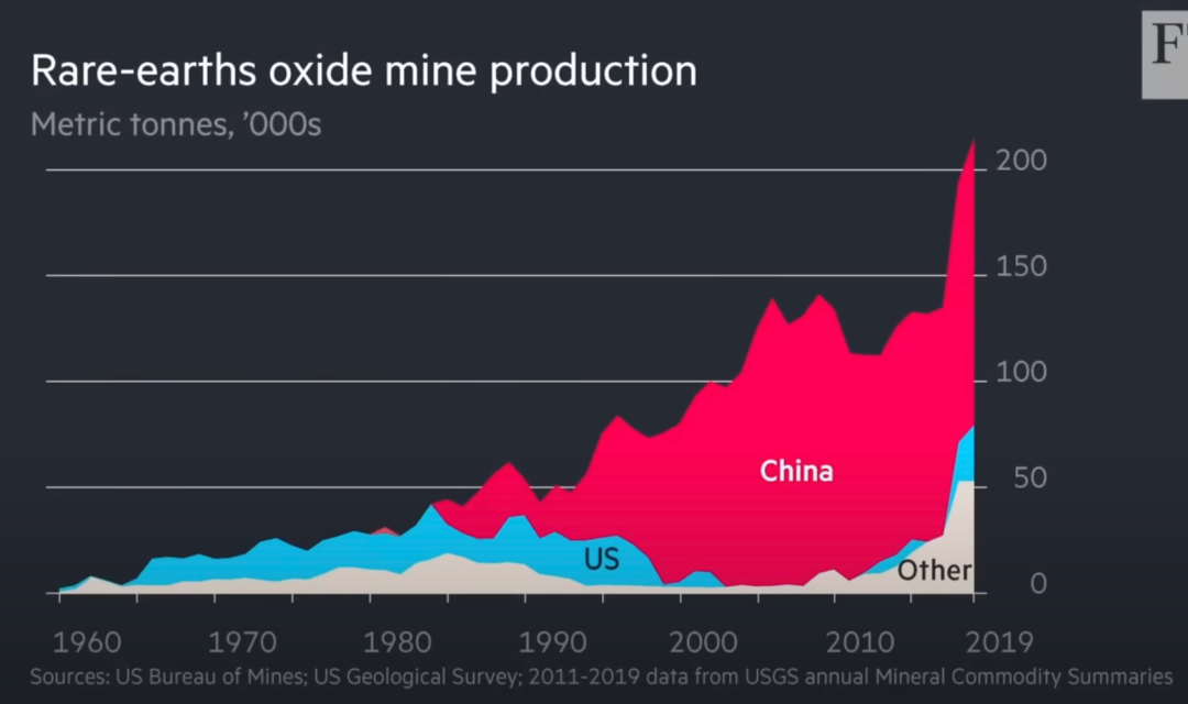 有意思的来了。过去几十年里,中国全球稀土市场份额的大幅上涨,一直没被西方国家重视。