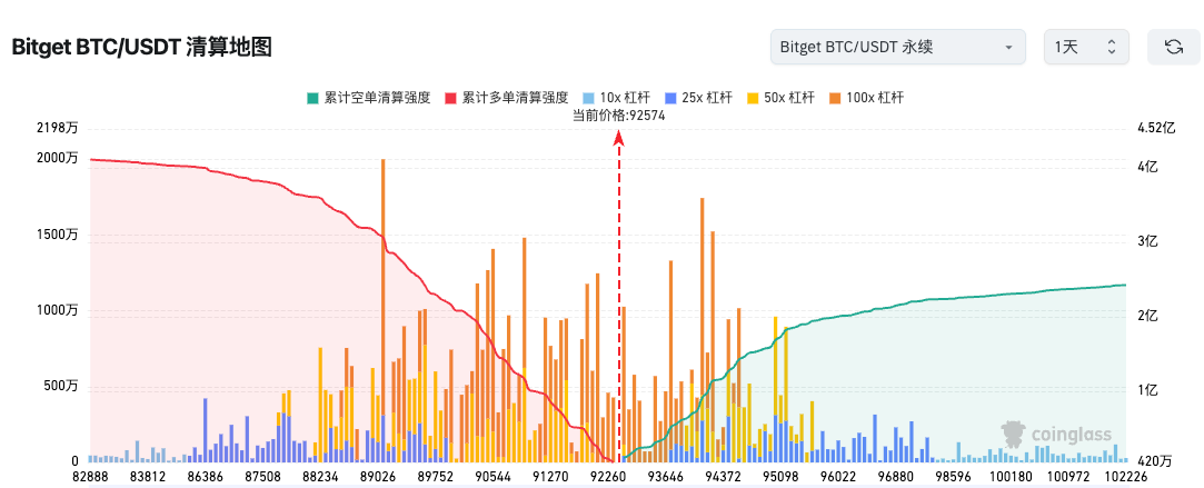 3、Bitget BTC/USDT清算地图显示BTC当前价 92574 USDT, 90000-94000区间多单清算密集,若下破或引发连锁清算风险,短线需警惕放量下跌;