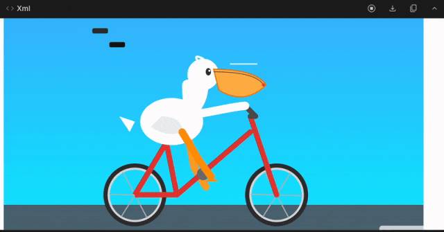我们又换了一个更为清晰的提示词:Create a single, complete, self-contained animated SVG code (no external files or images) of a cute pelican riding a bicycle from a side view. 这次 Gemini 3 生成的自行车似乎没有脚蹬。