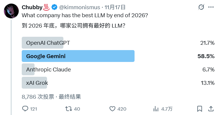 在 X 博主 Chubby 发起的「到 2026 年底,哪家公司拥有最好的 LLM?」投票中,Google Gemini 遥遥领先。