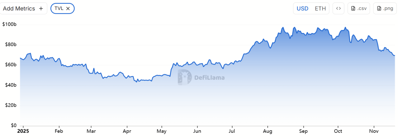 6.稳定币与DeFi震荡:以太坊生态自身的问题也集中暴露,进一步打击了投资者信心。10月11日暴跌当日,USDe因循环借贷套利机制失灵而崩盘,一度跌至0.65美元。尽管随后迅速恢复接近1美元,但已引发连锁反应。紧接着,去中心化稳定币领域再现多起风险事件:Stream协议发行的xUSD先因底层对冲基金爆雷而严重脱锚,随后同属一类策略的USDX也在流动性告急时跌至0.38美元,出现无法按1:1赎回的风险;另一算法稳定币deUSD同样未能幸免,纷纷跌破锚定价。这些曾被寄予厚望的新型稳定币,在极端行情下纷纷折戟,暴露出“delta中性”类稳定币模式在极端行情下的脆弱性和黑箱风险。稳定币的接连失守对DeFi造成重创。10月中旬起,多家借贷和收益聚合协议报告出现坏账和TVL暴跌:Morpho协议的USDC金库因关联的Elixir稳定币池子价值归零,不得不下架相关策略,造成约占金库3.6%的资产亏空;老牌借贷协议Compound也因部分长尾稳定币价值崩盘承受坏账压力,一度触发清算危机。Balancer协议则在10月底遭遇黑客攻击,损失金额达上亿美元。这些事件引发了DeFi资金的持续外流。截至11月上旬,Ethereum链上TVL已从年内高点的975亿美元降至约695亿美元,短短一个多月蒸发了超过300亿美元资产。