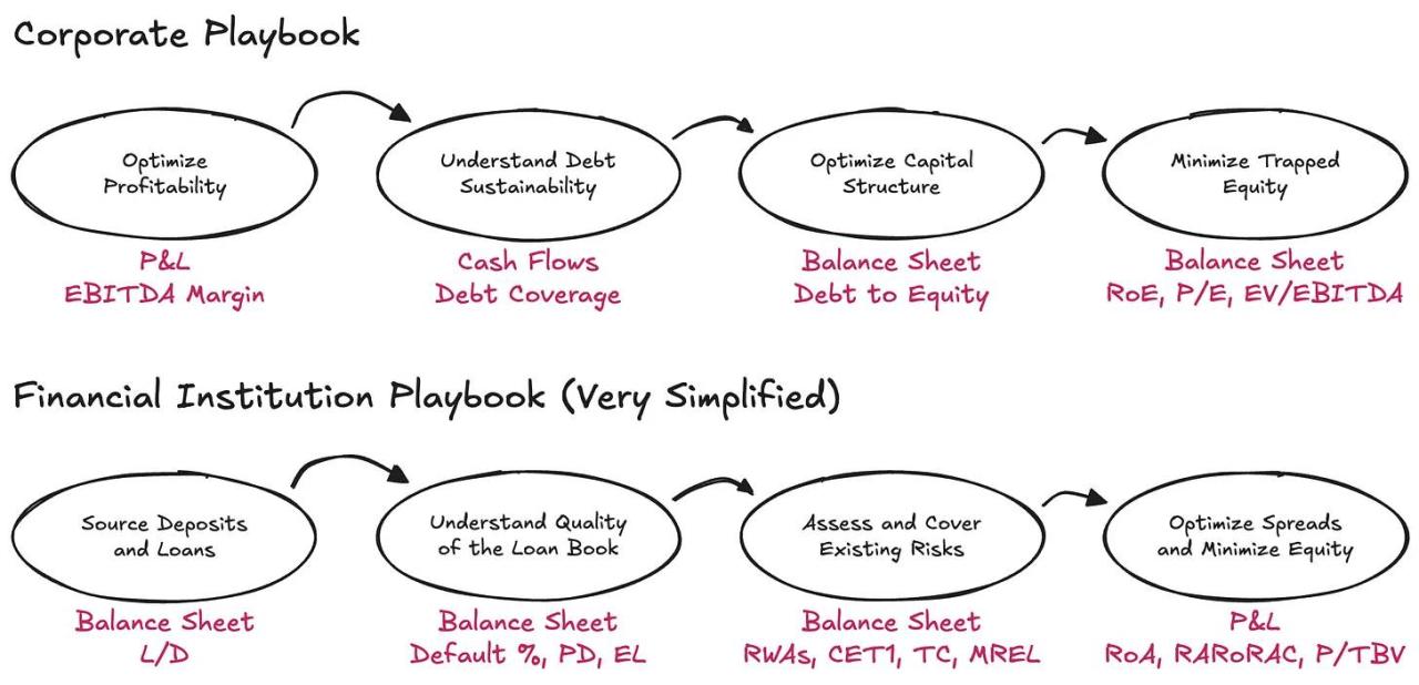 实际上,理解金融机构需要颠覆传统企业的逻辑。分析的起点不是利润表(P&L),而是资产负债表——并且要忽略现金流。而债务在这里不仅不是一种限制,反而是业务的原材料。真正重要的是资产和负债的排列方式,是否有足够的资本应对风险,是否能为资本提供者留下足够的回报。