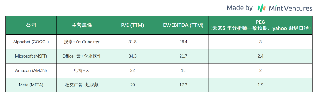 - Alphabet 的 P/E 与 Microsoft/ Amazon 大致相当,略高于 Meta;