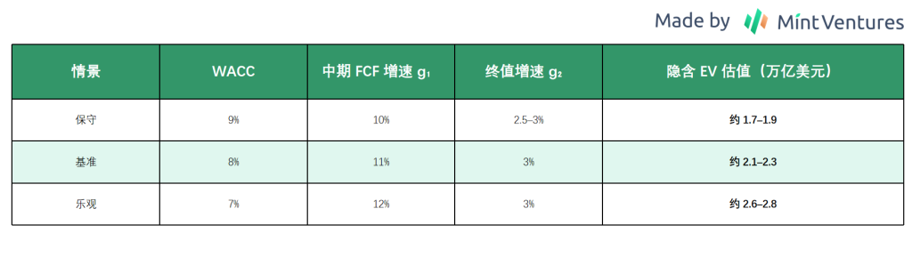 - 在较为传统的假设(WACC 8–9%、中期 FCF 增速 10–11%)下,基于目前高资本开支周期的数据,DCF 给出的合理 EV 区间多落在 2–2.3 万亿水平,明显低于当前 3.8 万亿 EV,具有较强的保守性;