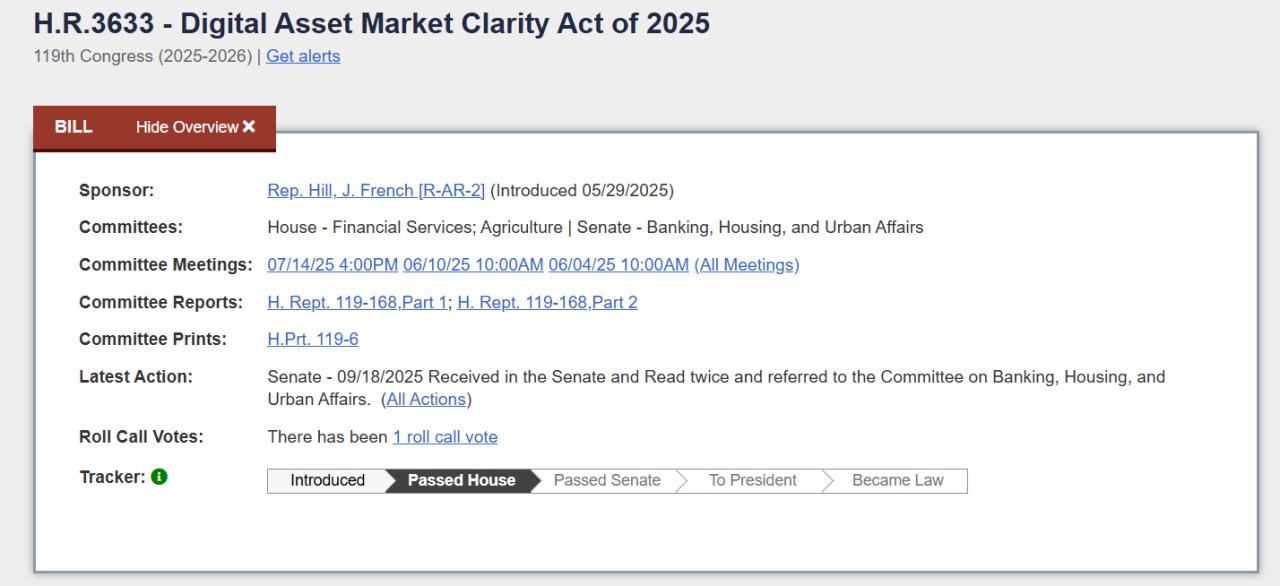2025年7月17日,CLARITY法案在众议院以294票赞成、134票反对获得通过。法案随后送交参议院审议。然而在众议院通过仅几天后,参议院银行委员会也提出了一份与CLARITY并行、竞争性的加密市场草案。参议院农业委员会和银行委员会分别就各自管辖范围的数字资产立法举行了讨论并公开征求意见,计划在2026年将两套方案合并为统一的参议院法案进行表决。