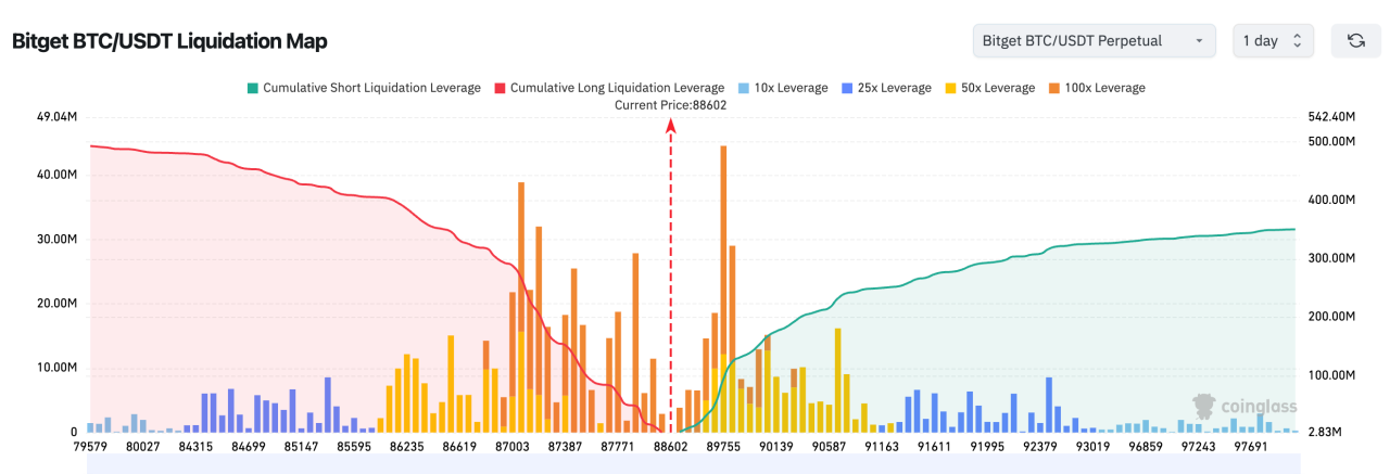3、Bitget BTC/USDT清算地图显示:当前价位附近(≈88.6k)是 多空分水岭:上方 89k–90k 区间密集堆积 50x–100x 多单清算,一旦放量突破,容易触发 多头挤仓、加速上冲。但下方 84k–86k 空头清算与支撑偏弱,多头仓位拥挤度高,若冲高失败回落,需警惕 假突破后的快速回撤与猎杀多单。