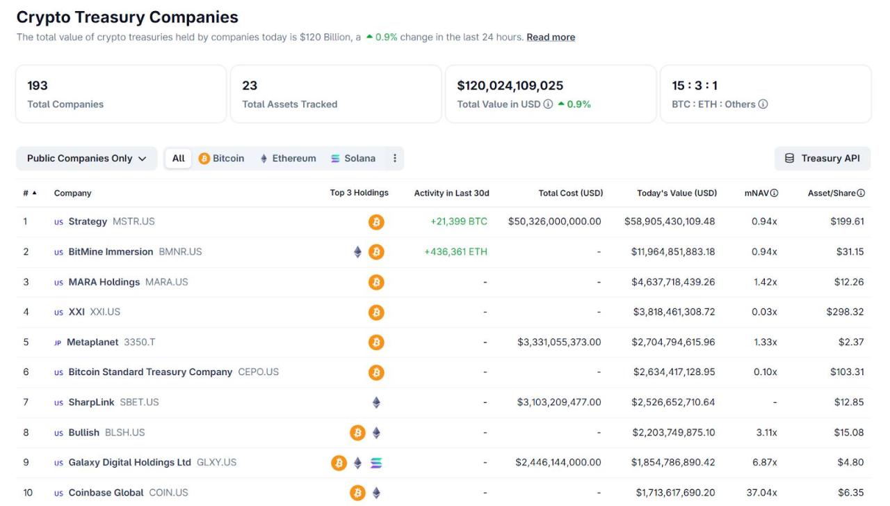受益于会计准则改革(允许加密资产按公允价值计量)和风险投资偏好的转变,大批中小市值上市公司宣布效仿MicroStrategy,将部分现金储备投入比特币、以太坊等加密资产,摇身变为“数字资产财库公司 (DAT)”。根据CoinGecko数据,目前共有193家上市企业发布了加密财库计划,筹资超过1,200亿美元用于购买BTCETHSOLBNB等加密资产加密资产。许多传统行业公司试图通过这一举动分享加密牛市红利,其股价也一度因持币消息而暴涨数倍。