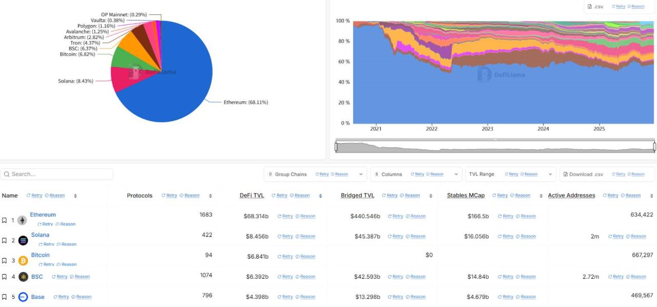 1)主链分工”进一步固化:以太坊继续扮演安全结算层与最大流动性底座,而 Solana、BNB Chain、Base 则更像高频交易与消费级应用的“流量链”。从 DeFi TVL 角度看,以太坊全年依然稳坐核心资产沉淀地位,2025年末其链上稳定币规模仍处在绝对领先的位置。