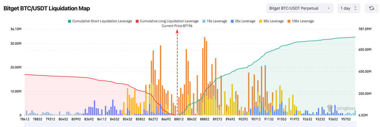 3、Bitget BTC/USDT清算地图显示:当前价格约 87,200 附近,正处于多空清算密集交汇区,上方 88,000–89,000 区域堆积大量高杠杆空单,一旦突破容易触发空头连锁回补。下方 86,000–87,000 区域多单密集,若跌破将引发集中止损,短线行情呈现“上下两端均高风险”的高波动结构。