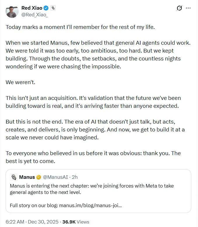 之前 Manus 20 亿美元估值的新一轮融资正在进行,已经是业界印证的消息,但不久前听到了 Meta 这个涉及接近 40-50 亿美元(小道消息未确认)的 Deal 的可能性,一度觉得有点假,更没想到会这么快,真是闪电般的速度。