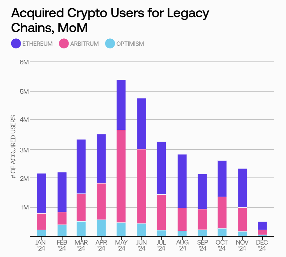 以太坊在 2024 年的增长超过了其两个领先的 L2 链,月均获取用户达 156 万,相比之下 Arbitrum 为 120 万,Optimism 为 34.88 万。不计算 12 月,以太坊仅有四个月出现环比下降,并在 3 月达到 190 万新用户的单月峰值——环比增长 33.4%。