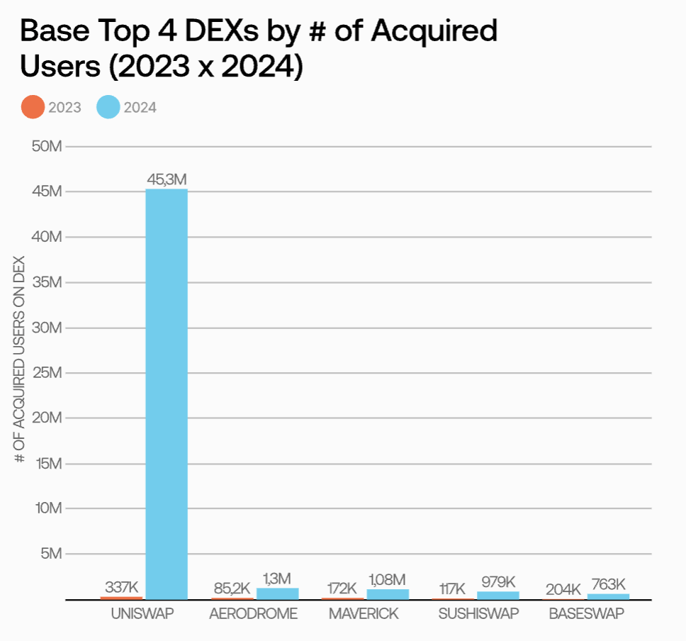• Uniswap:扩大了在主要公链上的主导地位,在 Base 上占据了 91.3% 的新增用户 DEX 活动,并且相比 2023 年在以太坊上的市场份额增长了 27.72%。