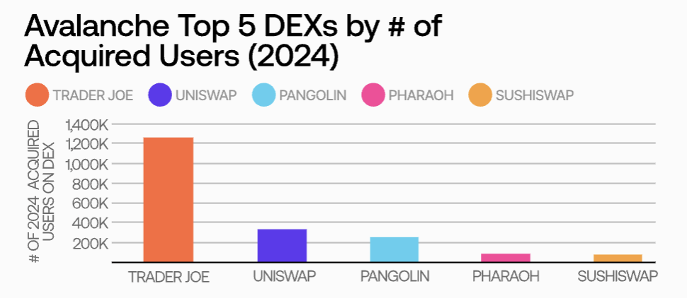 • 尽管 Uniswap 取得了增长,Trader Joe 仍保持着在 Avalanche 上的领先地位,市场份额达到 61.1%,相比 2023 年增长了 6.1%。
