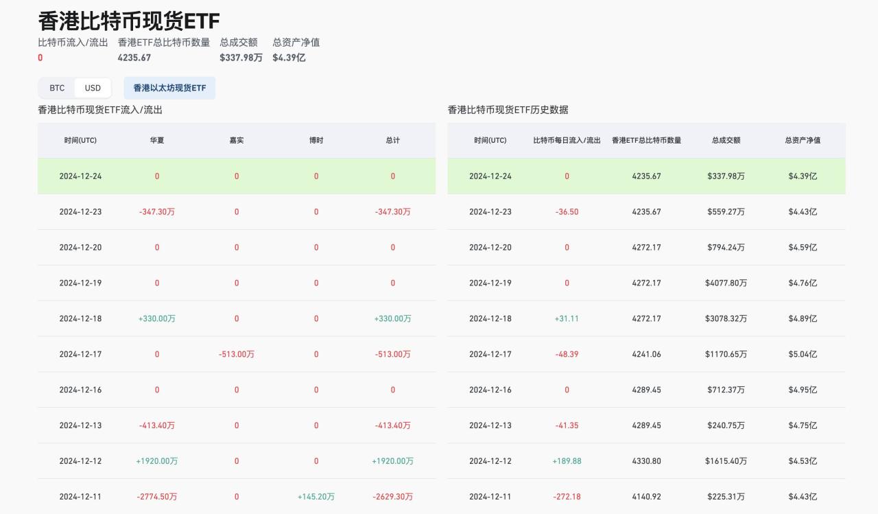 目前,香港市场已有 3 支 BTC 现货 ETF 和 3 支 ETH 现货 ETF,分别由华夏、嘉实、博时三家顶级机构推出。据 Coinglass 数据显示,截至撰稿,香港 BTC 现货 ETF 总资产净值达 4.39 亿美元,ETH 现货 ETF 净值为 6,356 万美元。虽然在规模上与美国还有距离,但香港的虚拟资产现货 ETF,已凭借创新与活力,迅速开始市场占位,为后续资金流入准备道路。于是,7 月香港迎来亚洲首只比特币反向产品——CSOP 比特币期货每日(-1x)反向产品;11 月,港交所推出虚拟资产指数系列,包括 BTC 与 ETH 的参考指数及汇率,为虚拟资产市场带来更多金融工具。