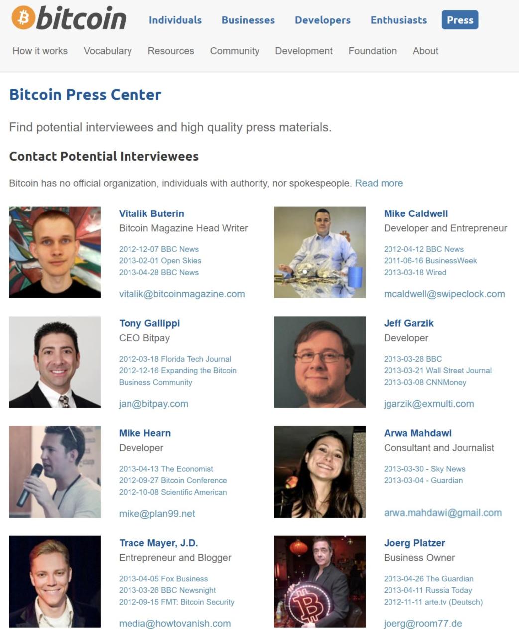 2013年3月22日,曾经著名的比特币开发者Mike Hearn在BitcoinTalk论坛上发帖,提出在Bitcoin.org网站上建立”比特币新闻中心”页面的想法,并邀请志愿者们提出自己作为新闻联系人的候选人。这样,如果有记者想要撰写关于比特币的文章,他们可以通过谷歌搜索比特币,发现这个页面,然后找到可以交谈的人及其联系方式。正如Mike所说: