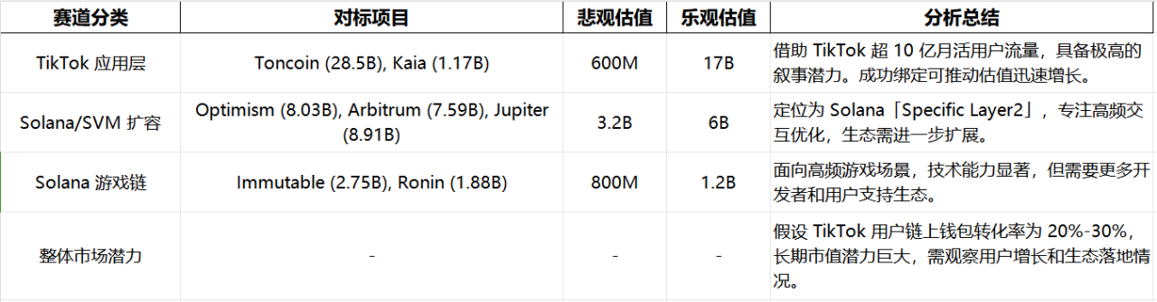 Sonic SVM 的估值可分为三个核心赛道:TikTok 应用层、Solana/SVM 扩容解决方案和 Solana 上的游戏应用链。通过对标行业内龙头项目的市值表现,Sonic SVM 的潜力逐渐清晰。