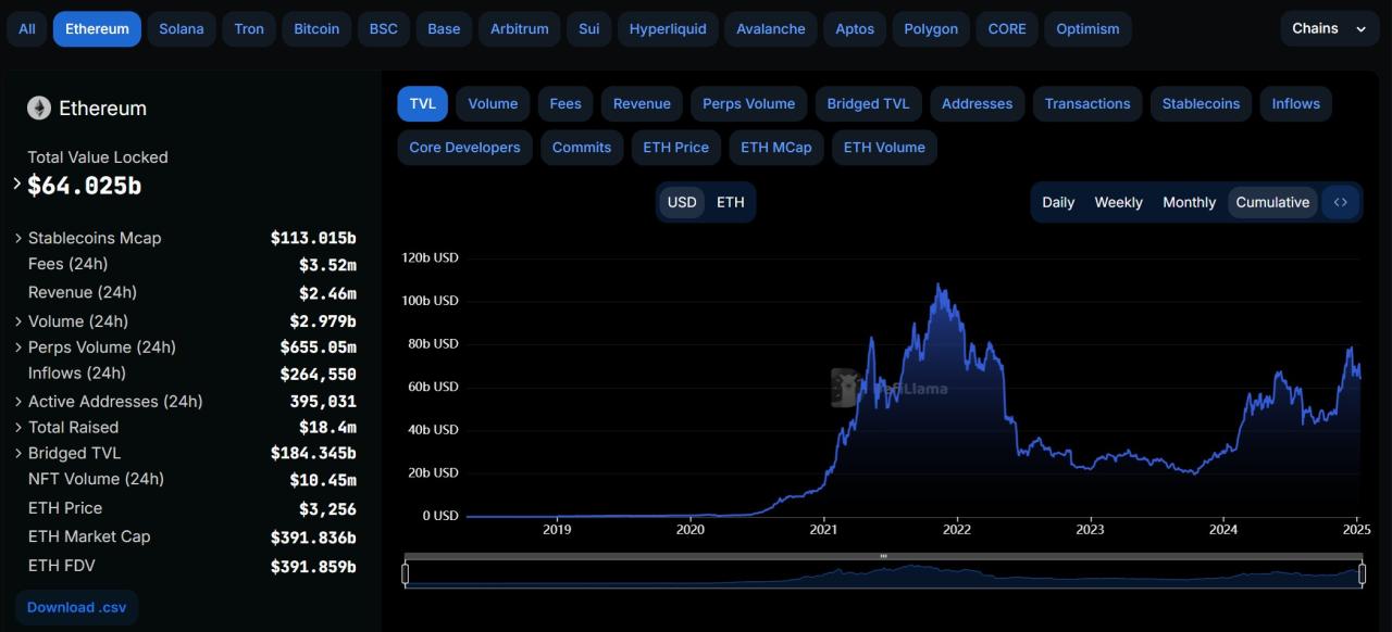 DeFiLlama 数据显示,截至 2025 年 1 月 9 日,以太坊链上总锁仓价值超 640 亿美元,较 2023 年 1 月(230 亿美元)大幅增长近 180%,只是同期伴随着 Ordinal 浪潮开始起势的比特币生态,即便 BTC 市值体量和价格涨幅都远优于 ETH,却始终追不上以太坊链上生态的扩张速度。