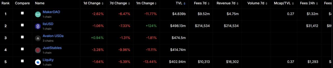 从稳定币的角度来看,链上去中心化稳定币依旧以债务抵押头寸(CDP)稳定币为主流—— MakerDAO 的 DAI 规模最大,liUSD、USDJ 等紧随其后。