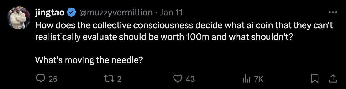 @muzzyvermillion:“为什么集体意识会认为某些无法实际评估价值的 AI 代币能值 1 亿美元,而另一些却不行?究竟是什么在推动市场的变化?”