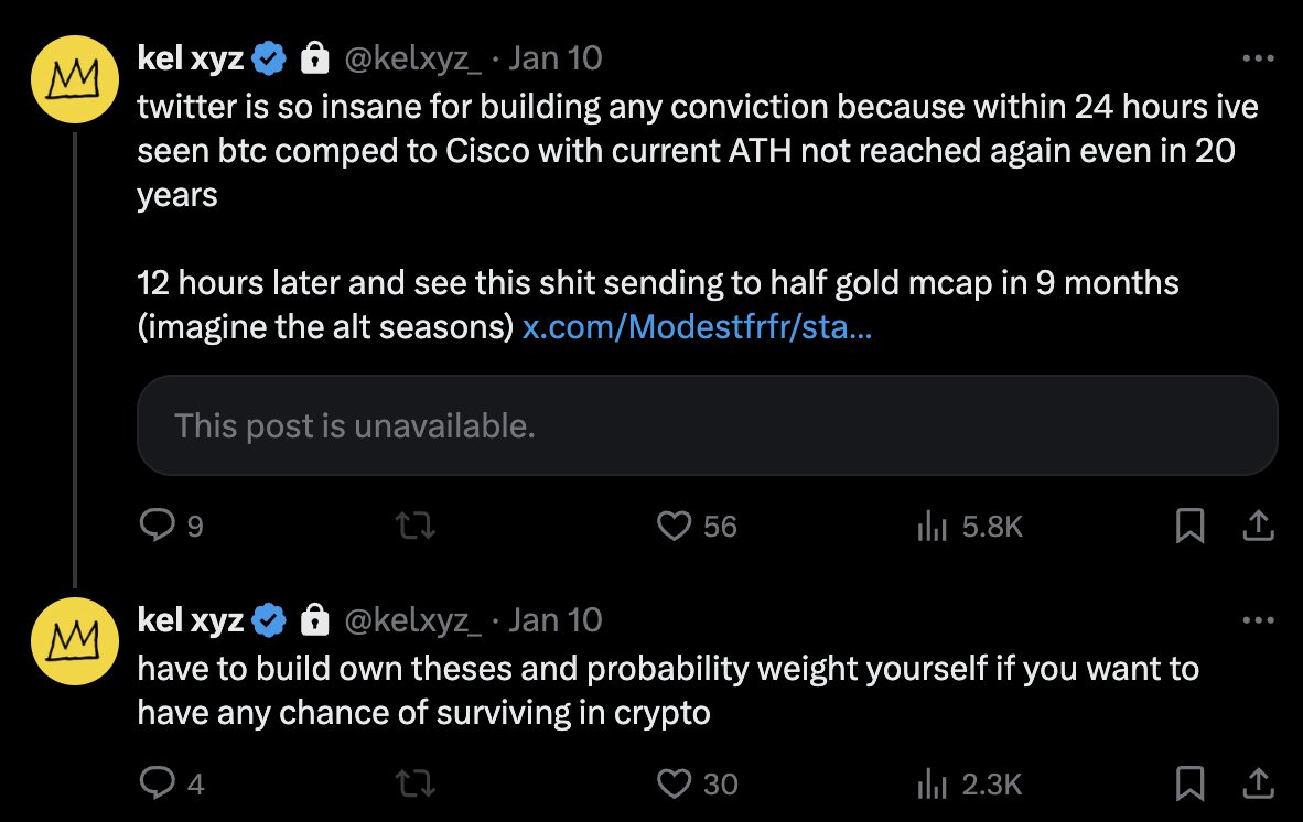 @kelxyz_ :“在 Twitter 上建立信念简直太难了。24 小时内,我看到有人把 BTC 比作 Cisco,声称当前的历史最高点可能 20 年都无法再触及。然而,仅仅 12 小时后,又有人预测 BTC 会在 9 个月内达到黄金市值的一半(想象一下如果真有这样的山寨币行情)。”