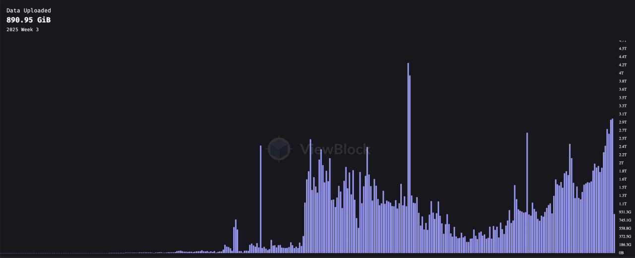 自 2018 年 6 月上线以来,Arweave 的使用量在 2021 年显著增长。下图跟踪了自网络启动以来每周的数据上传情况: