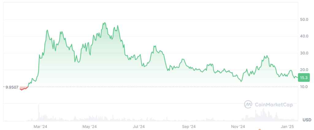 2024 年,在 AO 项目公布后,AR 迎来显著增长。公告发布后,Arweave 代币价格从每个不到 10 美元飙升至超过 40 美元。市场对 AO 为加密货币带来的可能性以及 Arweave 预期活动增长表现出强烈兴趣。