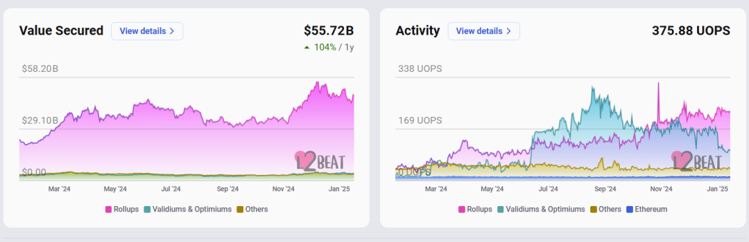L2Beat 的实时统计数据图表也体现了 Layer2 流入的资金超过 550 亿美金,按交易量来计算,总扩容幅度是原单主网的 2500% 以上。
