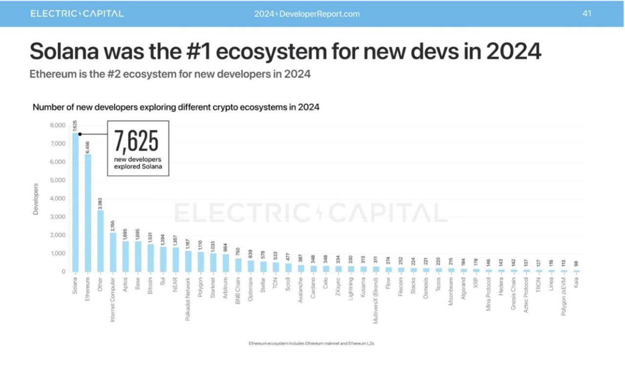 从任何一个指标来看,2024 年我们的生态都实现了显著增长。不管是交易量、用户量还是资金量等方面,都呈现出强劲的上升趋势。去年大概 9 月还是 10 月,我们在一些关键指标上超过了以太坊。一个是区块链本身的经济价值捕获(economic value capture),我们在 10 月就超越了以太坊。另外,如果看应用层的收入,我们也超越了以太坊。还有,根据最近的开发者报告,在过去大概 6 年,每年会出一个对各地区开发者数量详细统计的报告。从去年 7 月开始,增长最快的是我们的开发者社区。