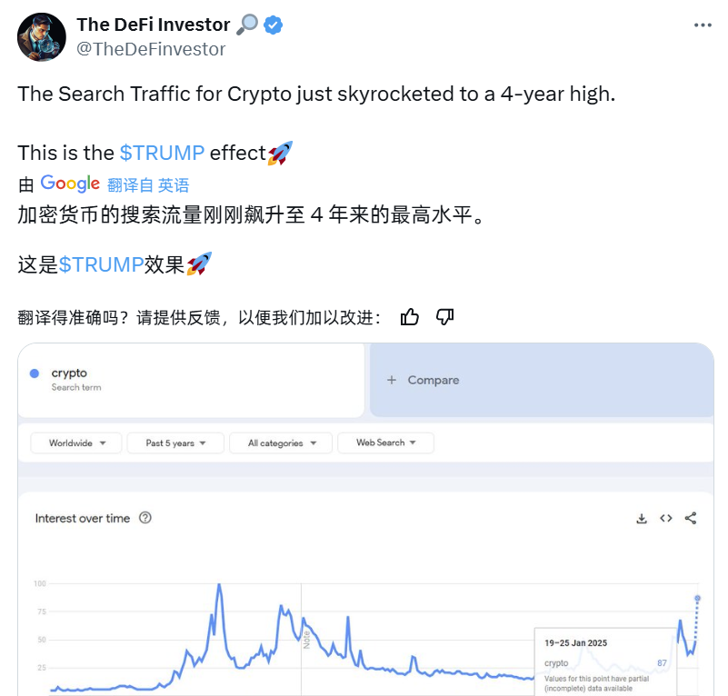 社交媒体上有人发帖称 Crypto 的搜索量飙升至了 4 年来最高的水平,这是美国新任总统高光时刻,它将全球目光都聚焦在这里,本次事件已然引起全球轰动的效应,让加密行业得以加速出圈,获得更多的曝光,越来越多人正在了解并进入该行业,当然讨厌币圈的人或许会因为这件事的曝光而更讨厌和排斥它。