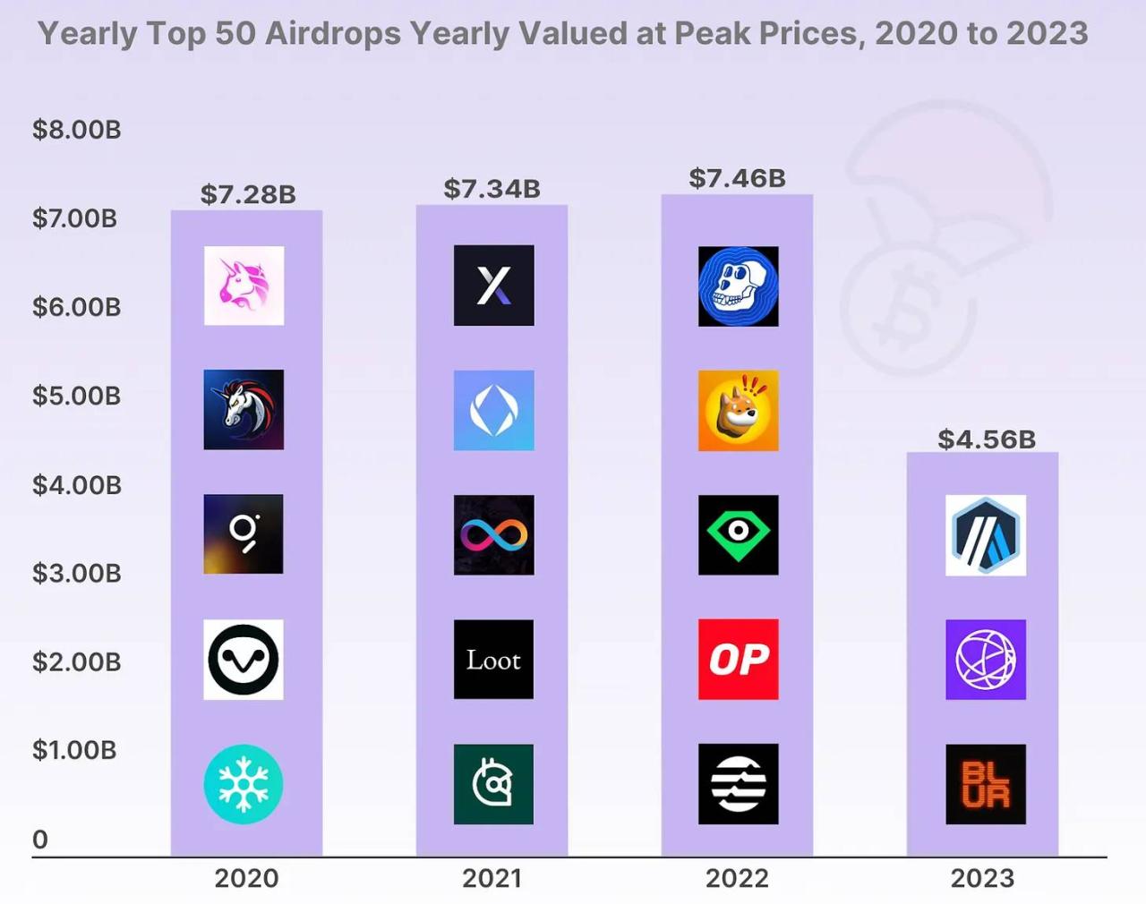 根据 CoinGecko 的统计数据,前 50 大空投的总金额高达 260 亿美元。
