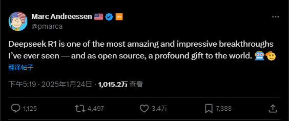 A16z的创始人,Marc Andreessen表示,”Deepseek R1 是我见过的最令人惊叹、最令人印象深刻的突破之一——而且作为开源,它是给世界的一份深刻的礼物。”