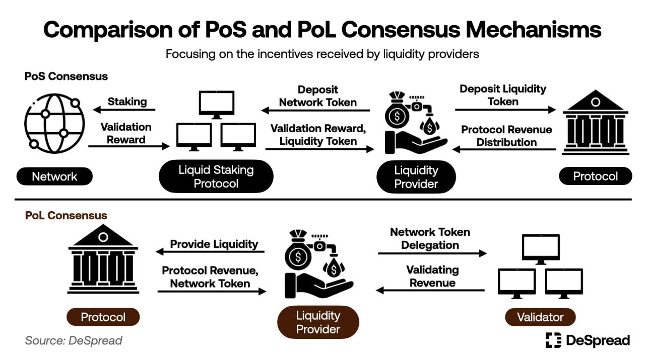 相比之下,虽然 Berachain 的节点运作需要 69,420 个 $BERA,但其结构为当流动性提供者将从生态协议获得的流动性代币存入 Berachain 时,他们会获得以 $BGT 计算的网路奖励以及流动性提供利息。因此,除了方法和顺序不同,Berachain 基本上已经将流动性质押内建在网路协议中。