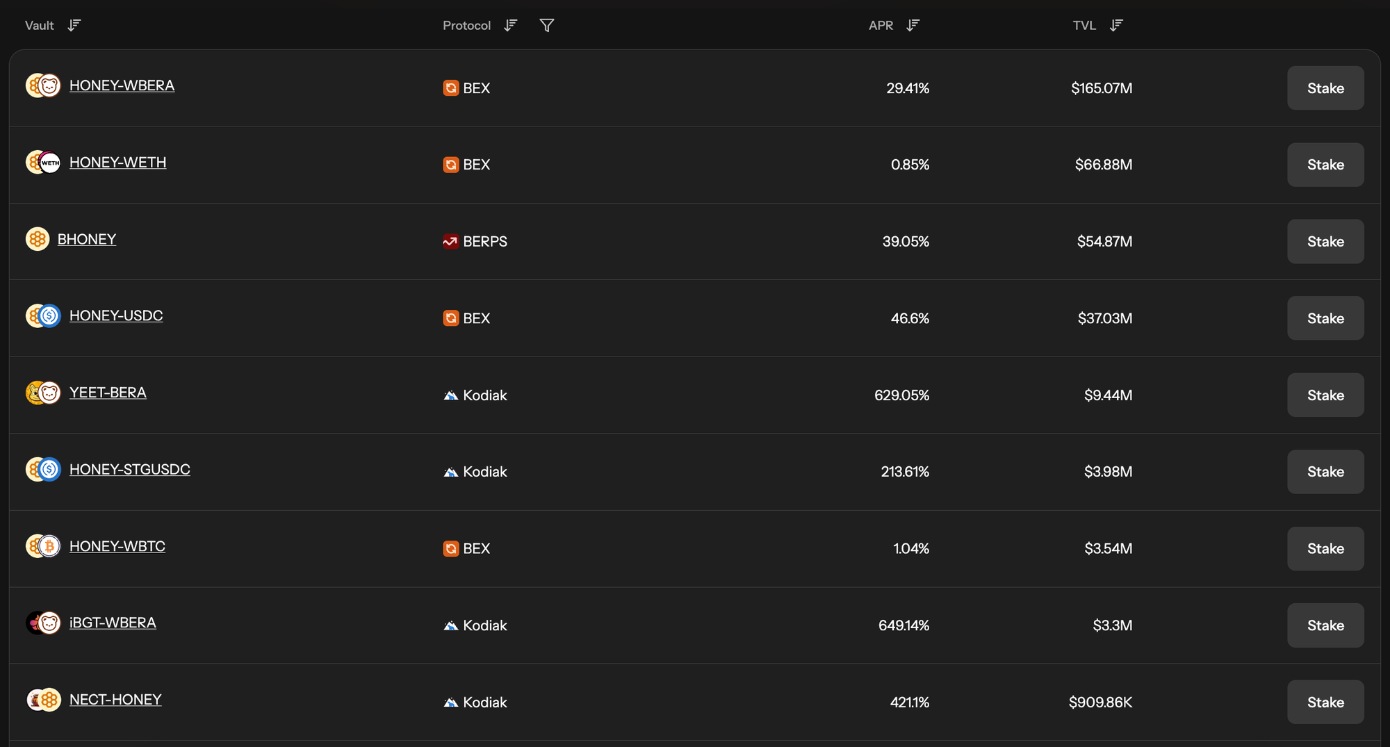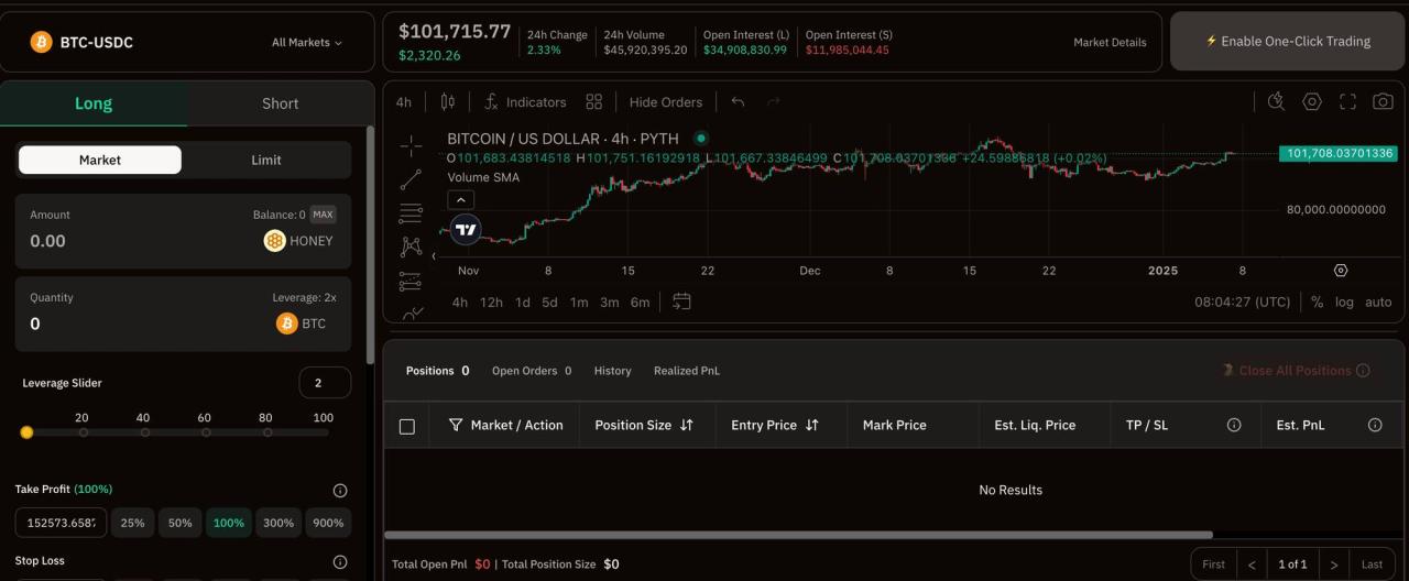 在 Berps 中,用户可以使用 $HONEY 建立各种资产的 100 倍槓杆仓位,或存入 $HONEY 以提供交易者仓位所需的流动资金,并收取交易费、资金费和 $BGT 作为回报。