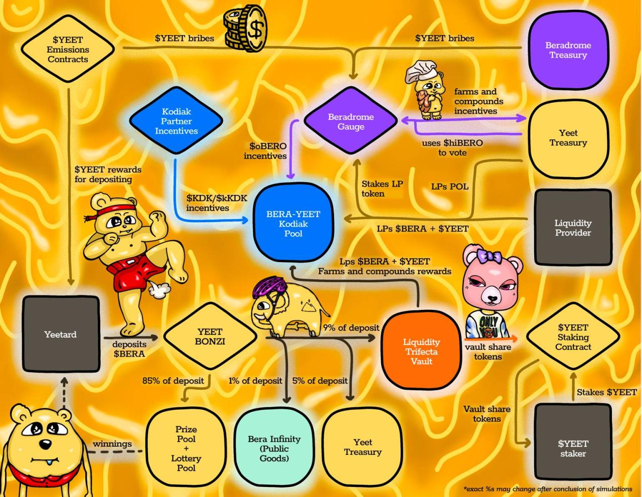 Liquidity Trifecta Vault 会从用户在游戏中存入的 $BERA 和投注的 $YEET 的 9%。而该金库会利用存入的资产向 Kodiak 提供流动资金,将从 Kodiak 收到的流动资金代币重新存入 Beradrome,将支付给定投者的利息最大化。