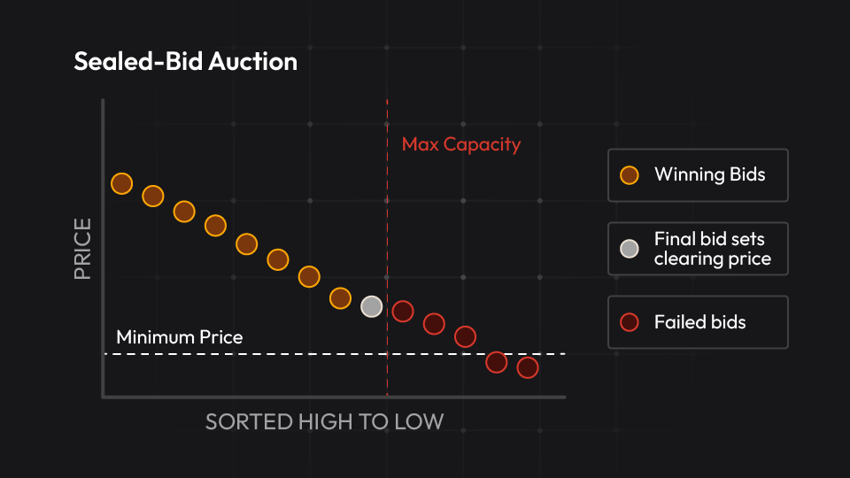 • 价格探索模式:与固定价格模式不同,任何人都可以参与。希望购买相当于其所需代用币价格 * 数量的存款资产的用户进行盲目竞价,以决定结算价格。以结算价格购买代币的权利从出价最高的用户开始授予。