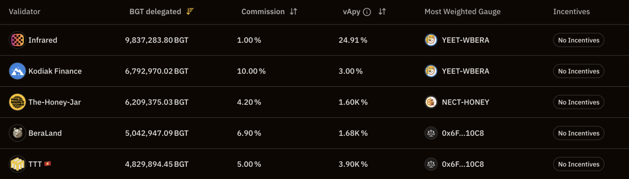 在目前的 bArtio Testnet 中,由 Honey Jar 运作的节点所获得的 $BGT 代表权排名第三,仅次于 Infrared 和 Kodiak 运作的节点。而我们也可以看出其次的排名也都是以社群为中心的项目,包括在 Podcast 提供 Berachain 相关资讯的 Beraland,以及为越南用户提供教材并营运节点的 TTT,都是仅次于 Honey Jar 获得最多 $BGT 代表权的项目。