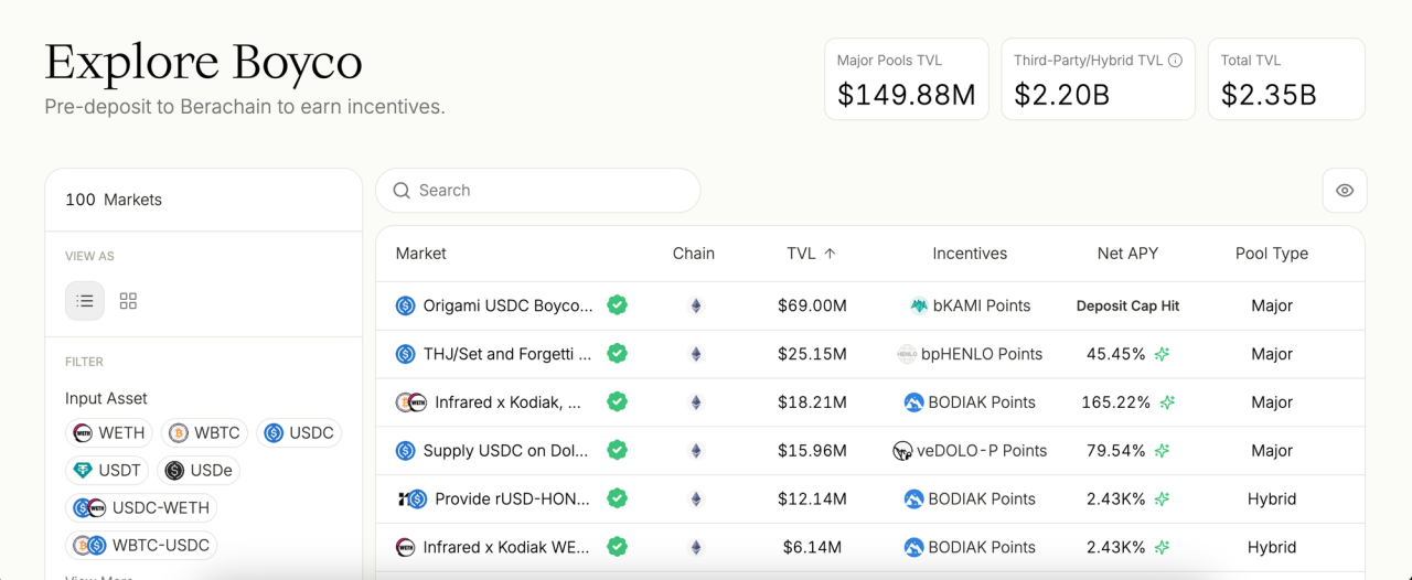 • Boyco:主网上线前的流动性平台,让计划在 Berachain 上部属的协议,可以在透明的环境下提前与流动性提供者协商流动性和未来奖励的分配计划。