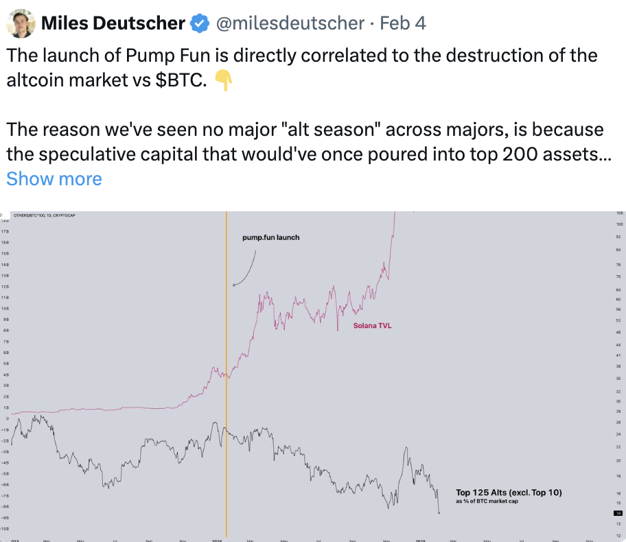 散户投资者直接涌向了链上的高风险投机项目,也就是所谓的“链上赌场游戏”(Pump Fun)。