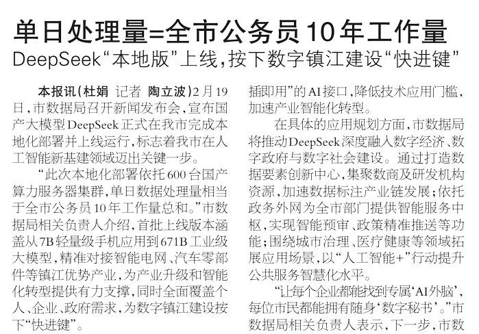 日前,镇江市数据局召开新闻发布会,市数据局相关负责人介绍称,本地化部署 DeepSeek后,“单日数据处理量相当于全市公务员10年工作量总和”。