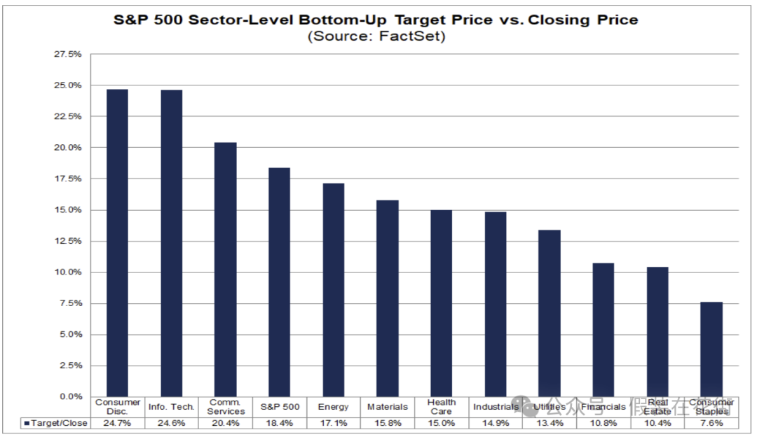 分析师们如今对标普500目标价6938,2月底收盘价(5861)有18.4%上行空间,其中消费服务(+24.7%)、科技(+24.6%)领跑,消费必需品 (+7.6%)预期最弱