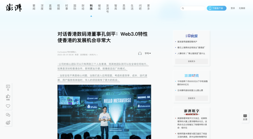 在 2023 年,香港数码港董事孔剑平接受澎湃科技采访时,也曾公开表示,深圳和香港之间的「前店后厂」模式,将为 Web3 发展提供便利。